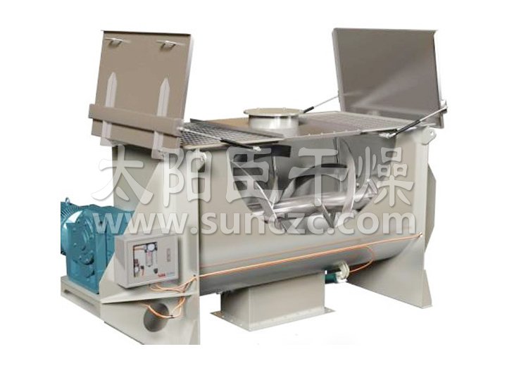 本系列混合機以強烈、高效混合為特點、臥式筒體內兩根攪拌等速反向旋轉,上特殊布置的槳葉確保物料徑向、環向、軸向三向運動,形成復合循環,在極短的時間內達到均勻混合。 產品特點